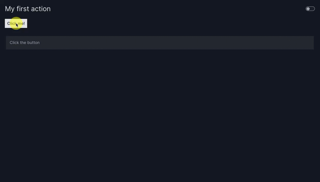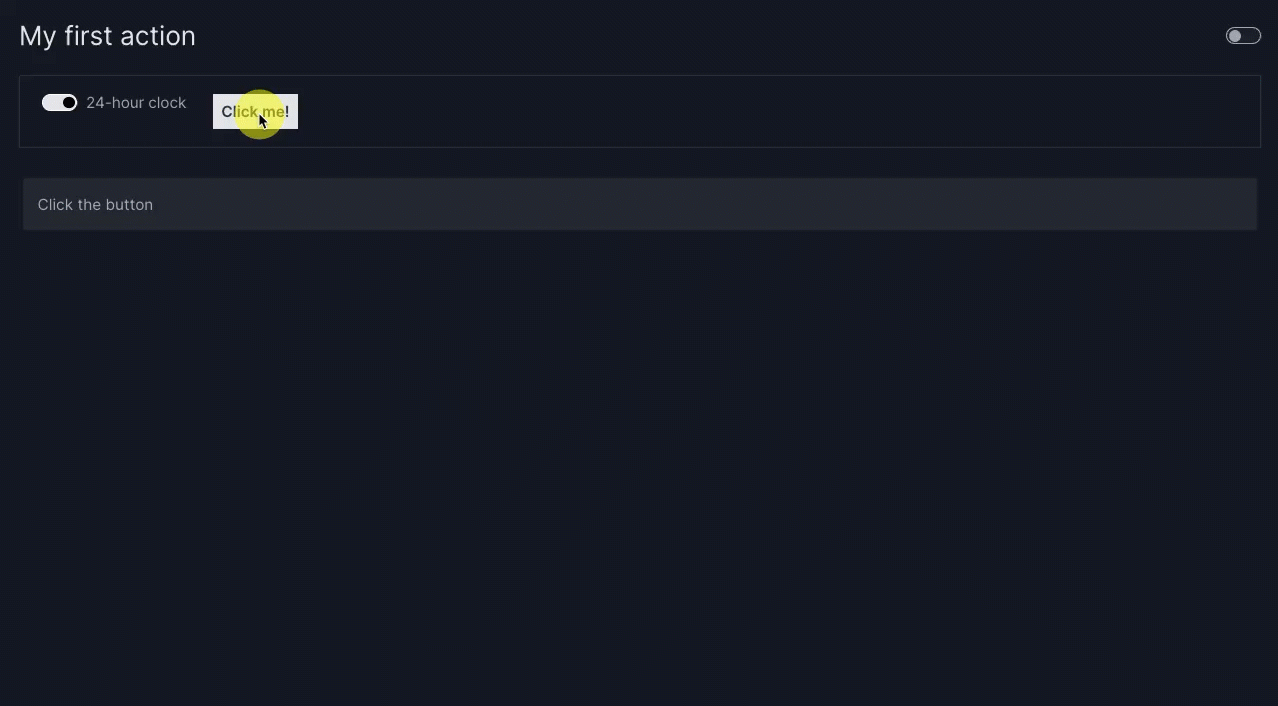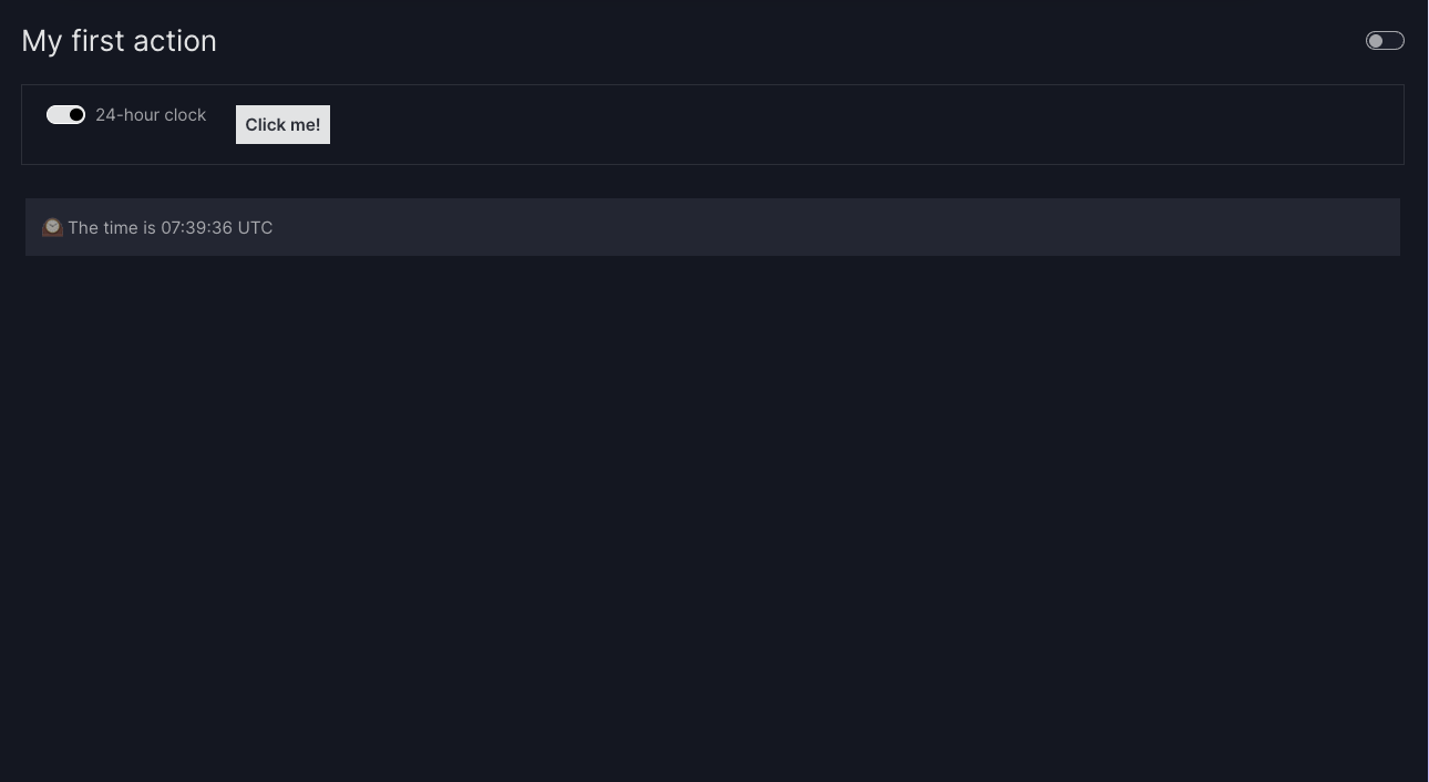 Congratulations on writing your first action! Before clicking the button, the card's text is "Click the button". When you click the button, the update_card action is triggered. This Python function executes on the server to find the current time in the UTC timezone and return a string "The time is ...". The resulting value is sent back to the user's screen and updates the text of the component with id="time_card". This is the action's output.