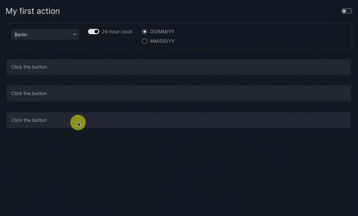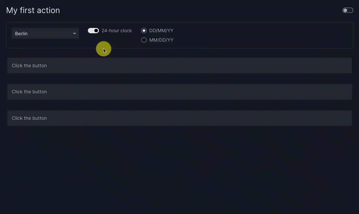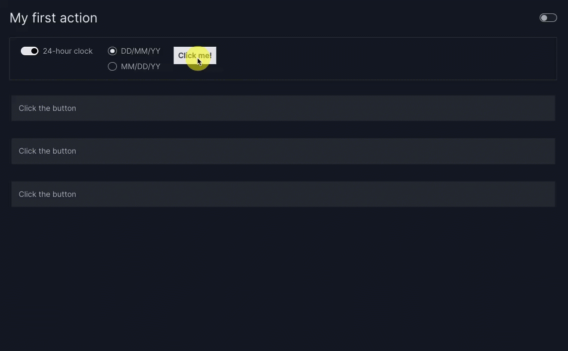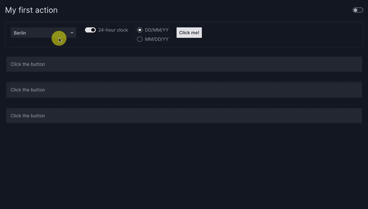 Have a go at toggling the switch and clicking the button. You should find that the format of the time shown changes between 12- and 24-hour clock. Note that toggling the clock_switch does not by itself trigger update_card. The switch is used as a runtime input but the action is triggered only by clicking the button. In fact, this is a key principle governing Vizro actions: an action can have any number of inputs and outputs but only one trigger.