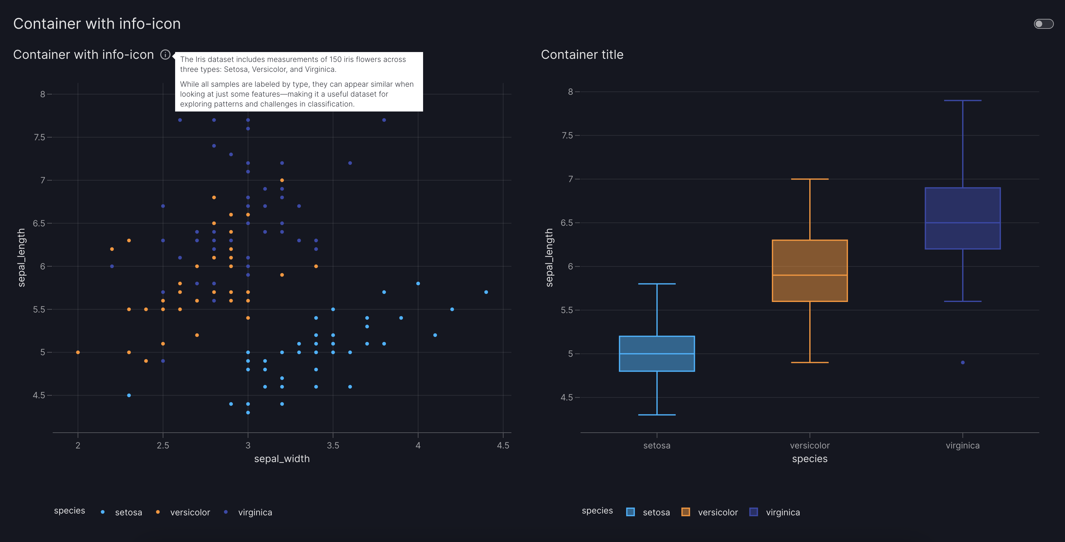 The description argument enables you to add helpful context to your container by displaying an info icon next to its title. Hovering over the icon shows a tooltip with your chosen text.