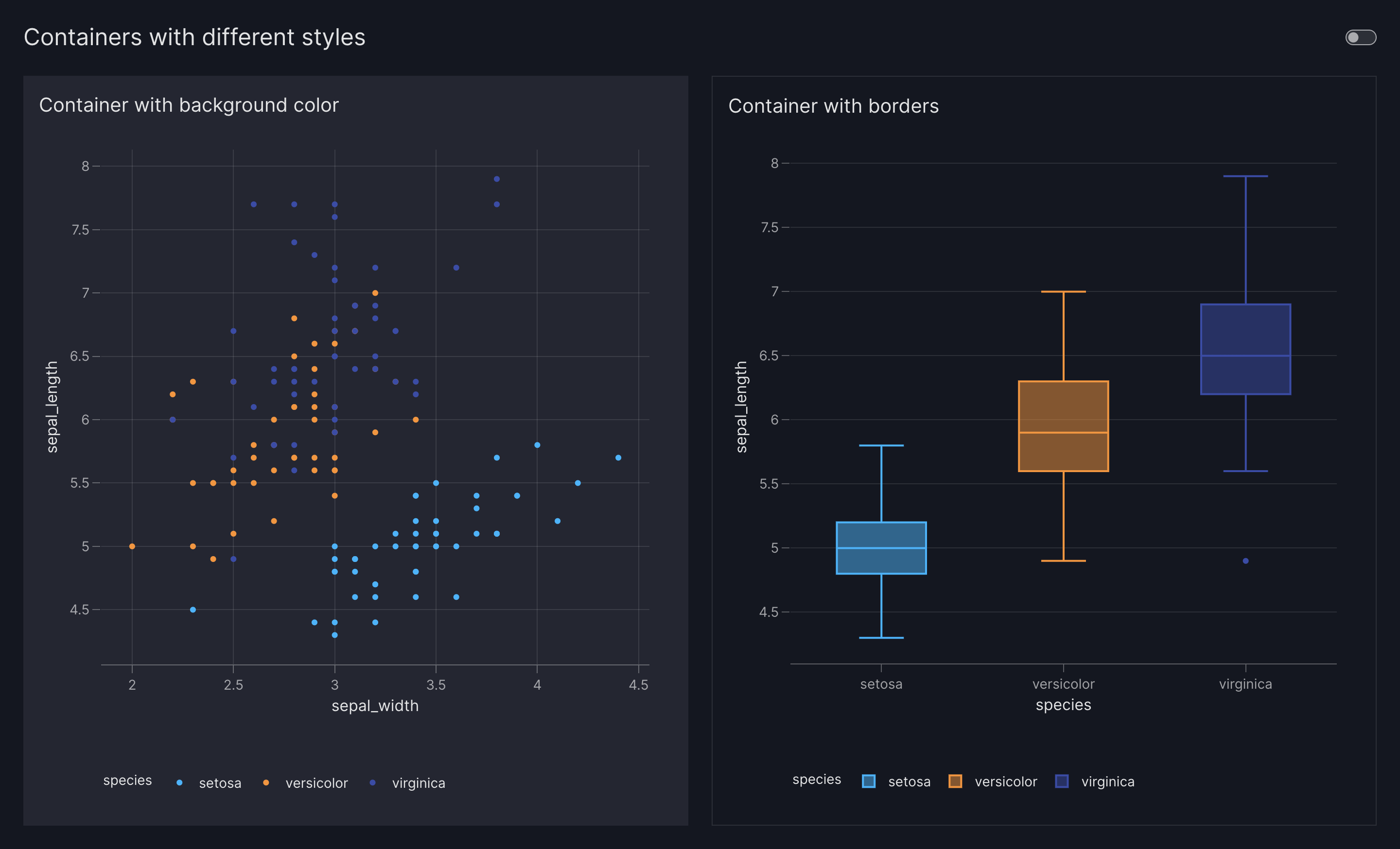 To make the Container stand out as a distinct section in your dashboard, you can select from the predefined styles available in its variant argument. This can be set to "plain" (the default), "filled" or "outlined".