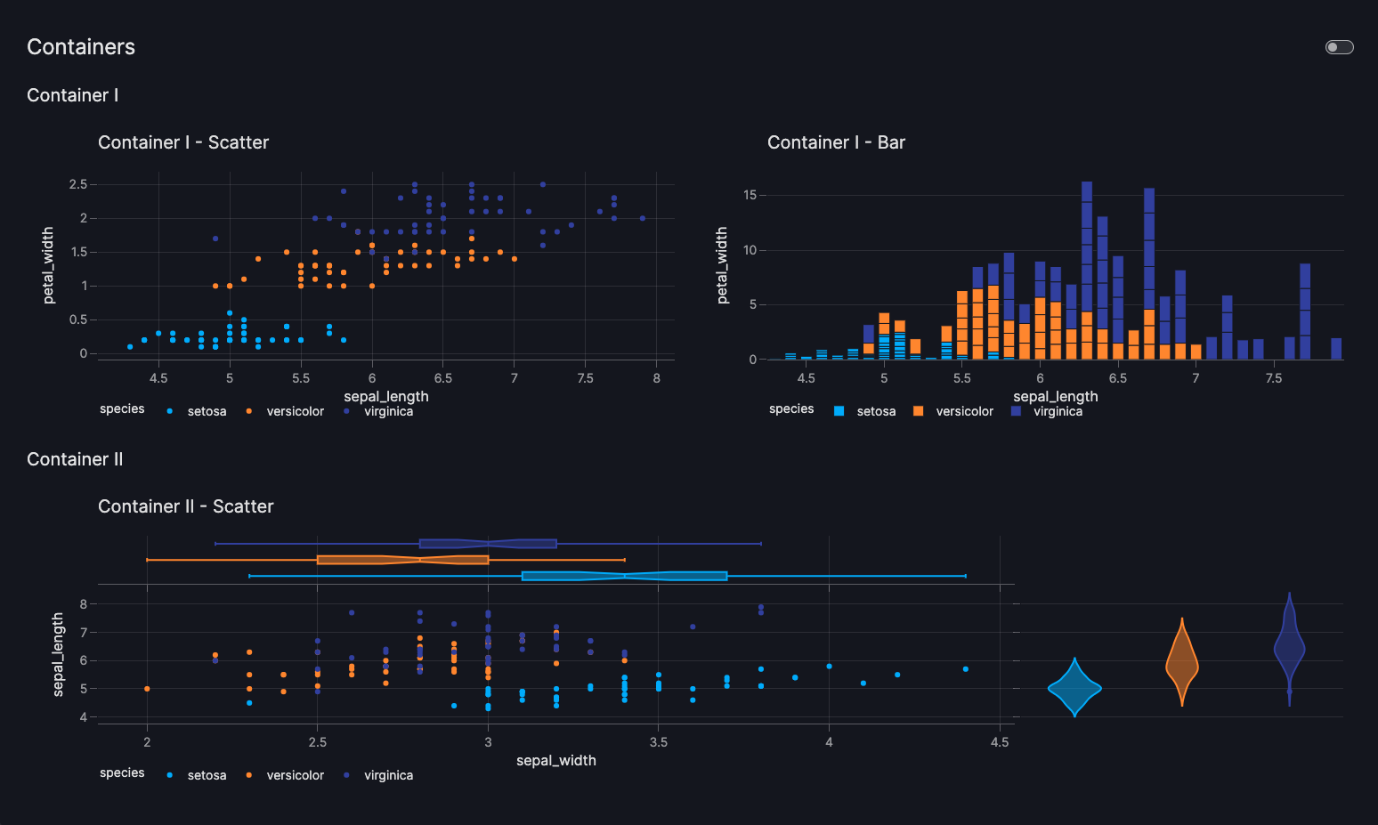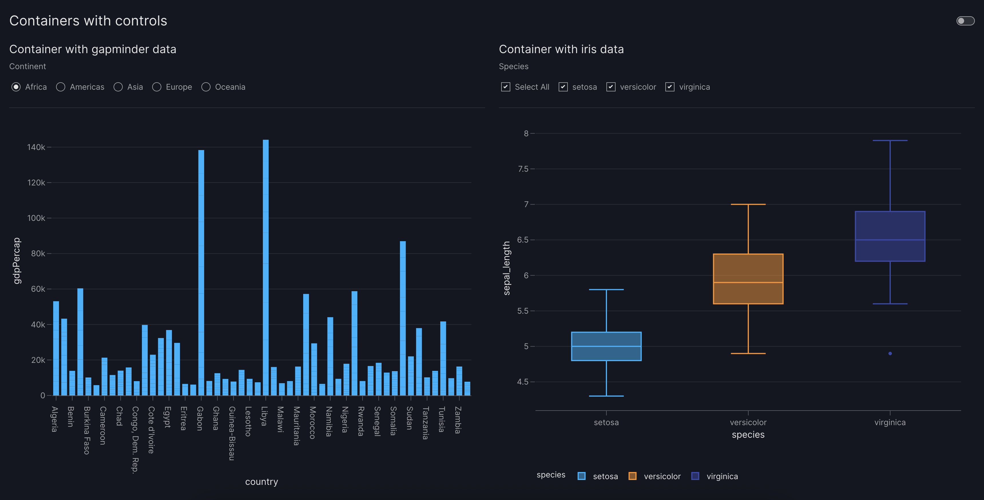 The Container has a controls argument where you can define container-specific controls such as filters and parameters. This groups together controls with their target components for better interaction. Controls can only target components inside their own container.