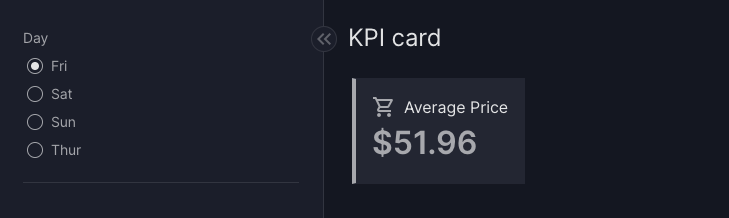 kpi_card: A KPI card that shows a single value found by performing an aggregation function (by default,sum) over a specified column. Required arguments aredata_frameandvalue_column. -