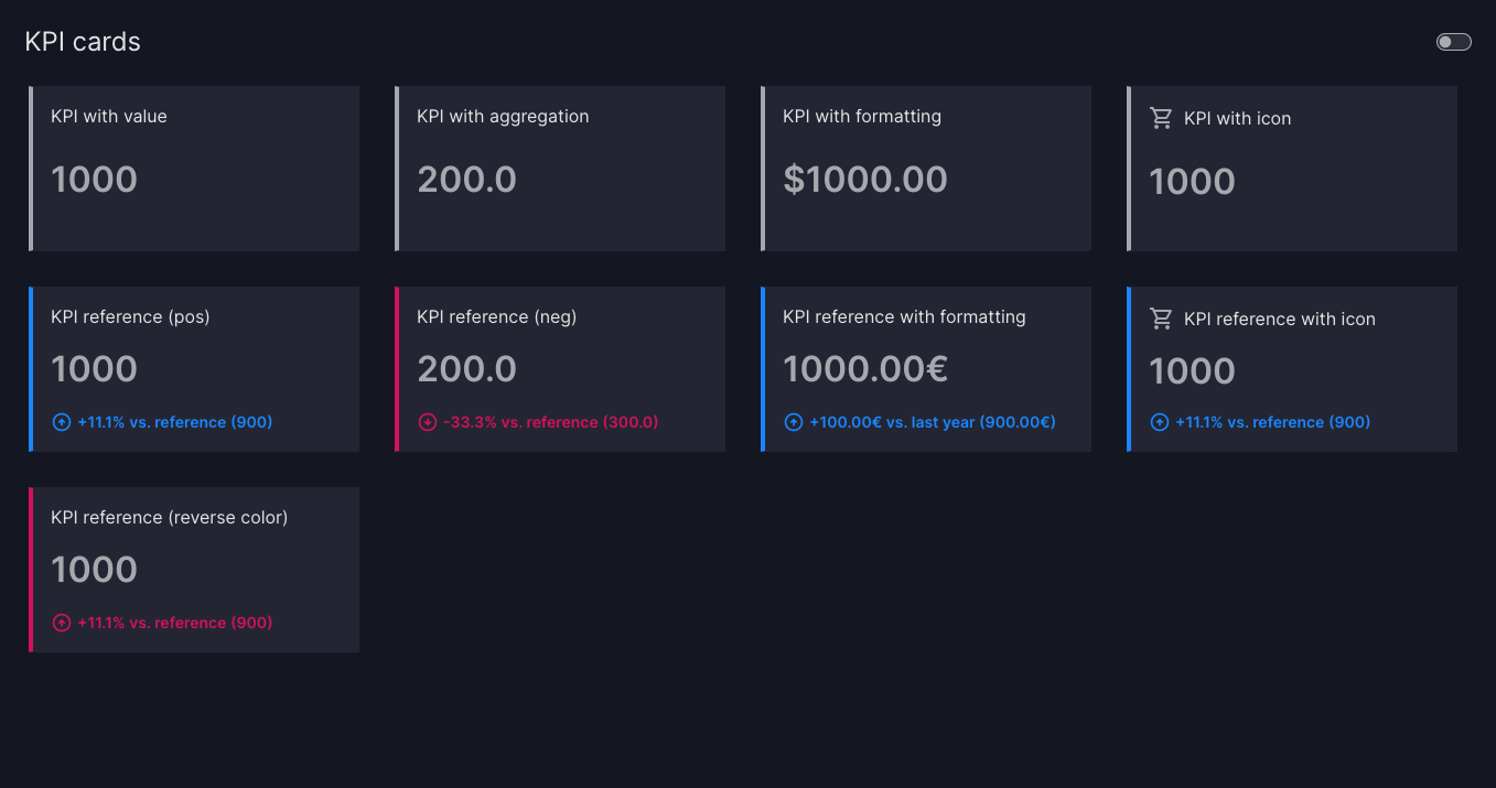 kpi_card_with_reference: A KPI card that shows a single value and a delta comparison to a reference value found by performing an aggregation function (by default,sum) over the specified columns. Required arguments aredata_frame,value_columnandreference_column.