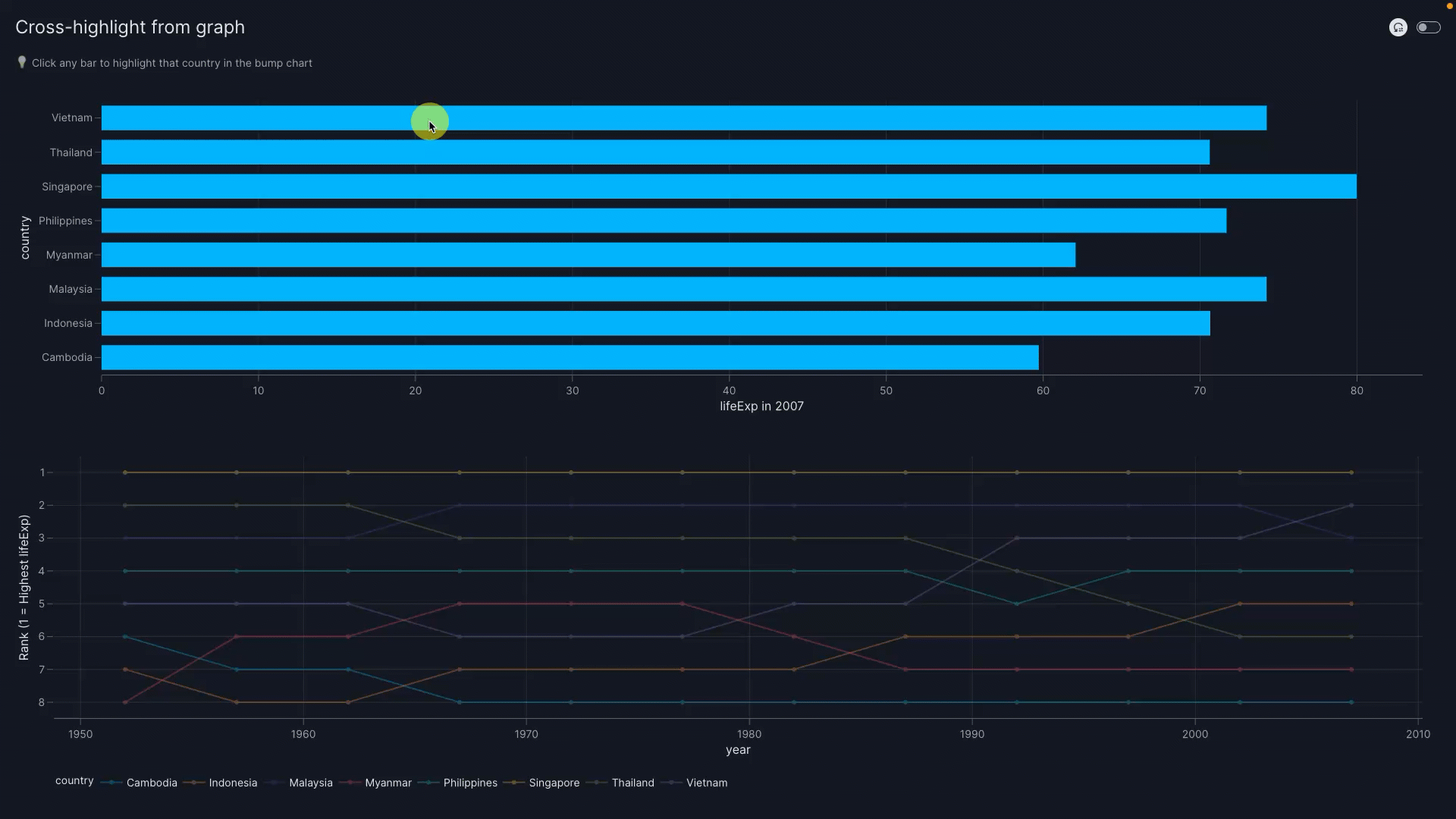 "NONE"as an option, corresponding to a parameter valuehighlight_country=None. This is used so the bar chart is initially unhighlighted. - We set