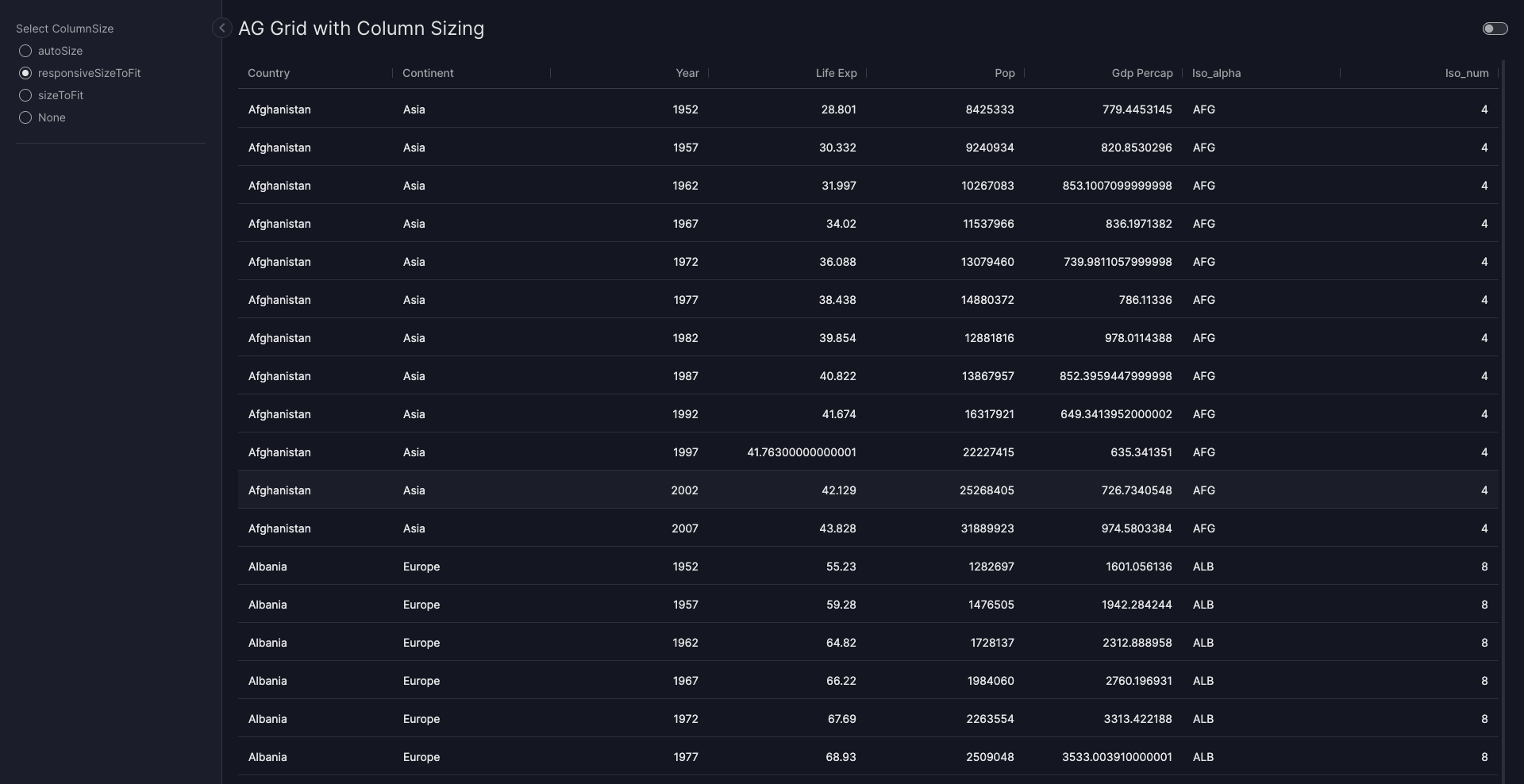 columnDefs = [{"field": "country"}, {"field": "year"}, {"field": "lifeExp", "cellDataType": "numeric"},