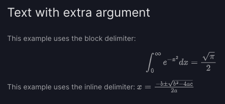 An example use would be to set mathjax=True (defaults to False) to display mathematical equations. For this, you can use extra={"mathjax": True}.