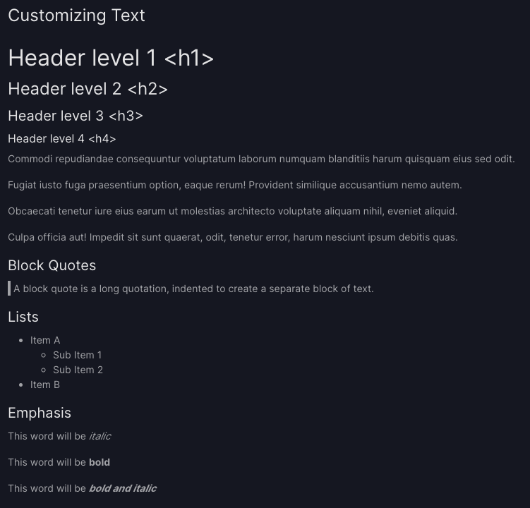The Text model uses the dcc.Markdown component from Dash as its underlying text component. For more details on customizing the Markdown text, refer to the dcc.Markdown component documentation. Based on examples from Dash, the Text model supports the following: